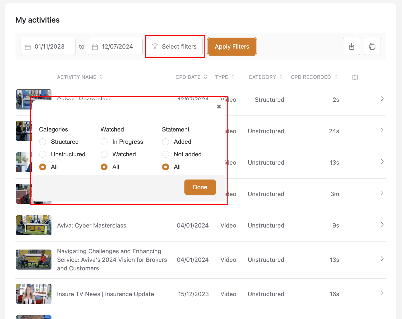 - Filter your CPD history to show the most appropriate results