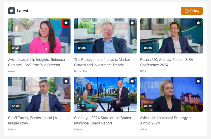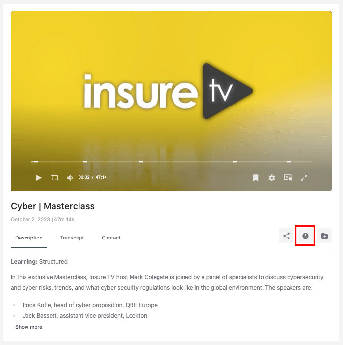 To add videos to your Watch Later playlist simply click on the ‘Watch Later’ icon where ever you see the video listed, or under the player on the video's page: